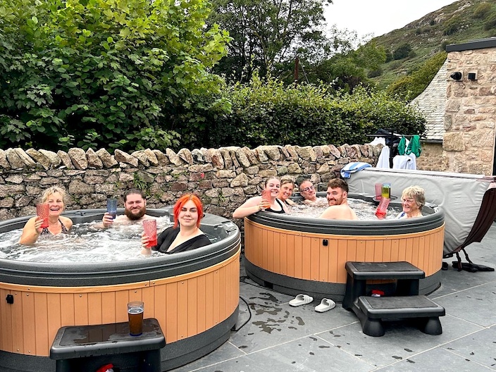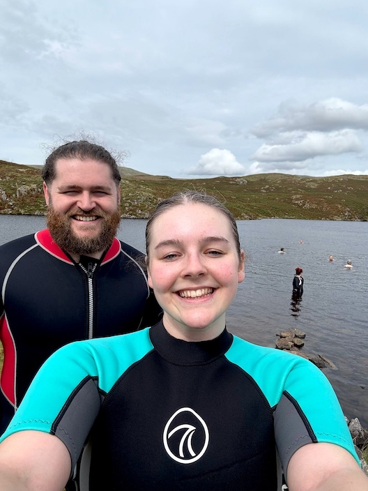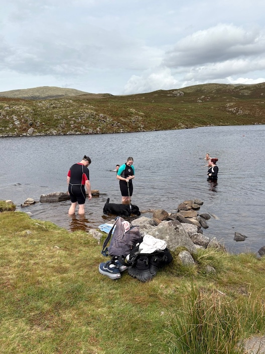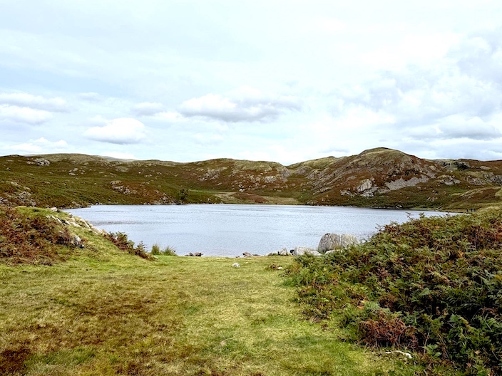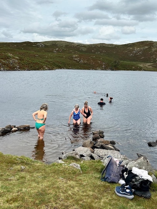 Wild water swimming didn't seem the ideal activity for the beginning of September in the Lake District. However, this was the plan and fortunately reasonable weather was forecast. Preparations took some time as towels, robes, wet suits, 'water shoes', etc. etc. were gathered for some whilst others just had towels and bathing costumes!! The route through bracken was reasonably good and the ascent quite gradual. Brief stops were needed to take in the views of Hardnott Pass and the surrounding fells. |