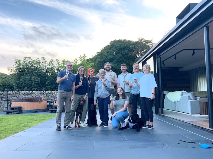 The house is set in a large garden surrounded by fields and woodland. A nearby stream, sheep and deer add to the picture of the most wonderful place to spend the weekend. Further afield the fell tops add to the atmosphere as does the promise of a nearby tarn for wild swimming. Who could wish for a better place or way to spend an 80th birthday celebration! |