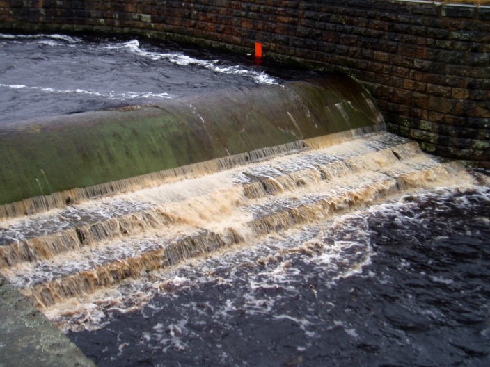 with brackish, brown water surging down the spillways . . .