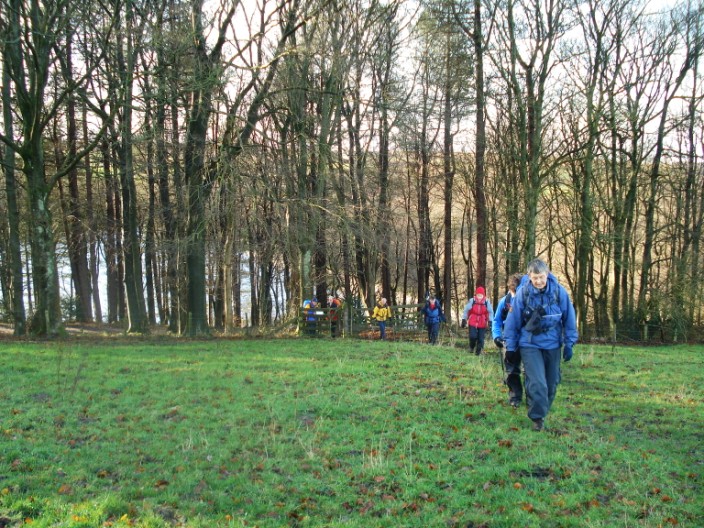 Leaving the woodland the reservoir can be seen through the leafless trees . . .
