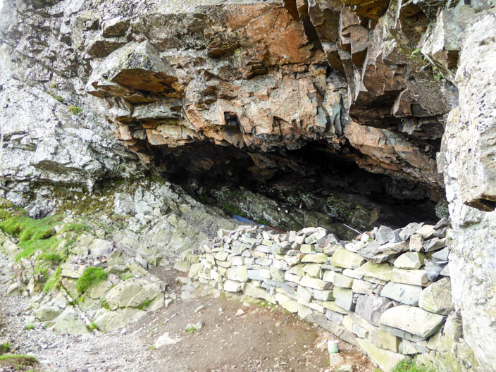 A little further on the cave can be seen again, near the left edge of the rock face . . .