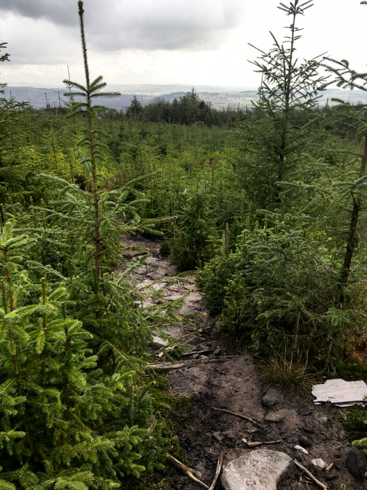 Marie exits the trees after we navigate around a path blocked with lots of fallen trees