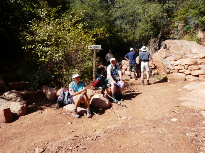 As we left Phantom Ranch the route lay along a meandering path closely hemmed in by vertical canyon walls, which added to the darkness of a 5.50am start! After 20 minutes or so we were able to switch the torches off, as the light gradually made its way into the canyon. With an easy gradient for the first 7 miles there was time to enjoy the constantly changing scene and to see the colours come to life as the sun hit the tops of the canyon walls. After a stop at Cottonwood camp ground - for second breakfast - we continued along the steeper second half of the route. With quite a slow pace there was plenty of time to take in the magnificent views, rock formations and colours. Photographs could not do justice - but I took enough to make a good attempt at capturing what I could see. Turning into Roaring Springs Canyon we could finally see North Rim - with some rather dark clouds above it! Some precipitous sections added to the adventure and the sheer thrill of the day almost made one forget the angle of ascent. The weather was perfect, being somewhat cooler than normal after the rain and storms of the previous couple of days. Although we had expected the North Rim to be colder than the South Rim, stepping out onto the trail head at 8,300 feet, with a cold wind blowing, we were sent scurrying into our packs to retrieve the warmer clothes we had carried. When everyone had been welcomed to the top our walk to the coach was spurred on by the promise of a 'Champagne Celebration'.