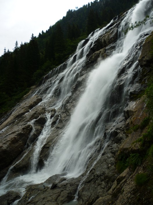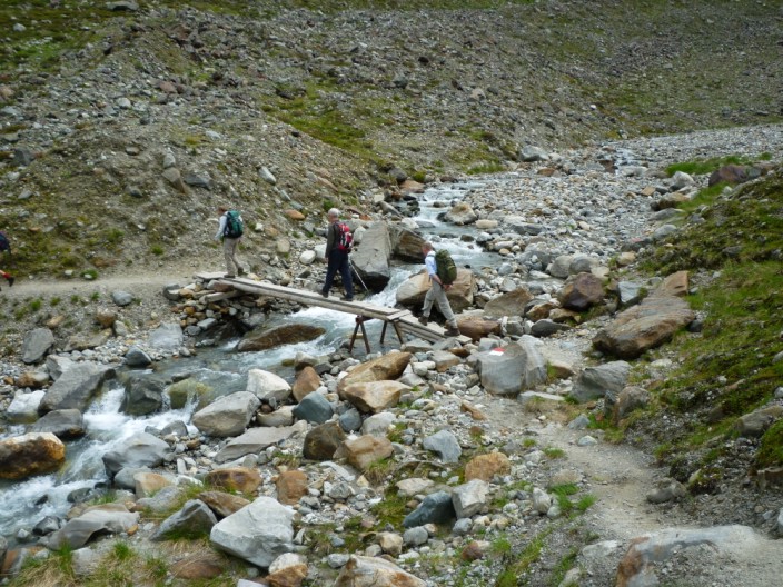 We caught the bus to the starting point near Grawa Alm, a scenic drive along the valley from Fulpmes. Unusually our path headed downhill, but this enabled us to take a delightful woodland path that made its way up alongside the Sulzenaubach with its impressive waterfall. Emerging into a hanging valley the views were magnificent, surrounded by rock walls, ridges and summits. Though we weren’t stopping at the first hut it was worth taking time to photograph the carvings on the backs of the seats. Heading for another waterfall we found a pleasant zig-zag path that took us up to the Sulzenauhütte and a break for refreshments. From here we could see the Nierdel Col with its steep sides. However, after following an undulating path for a time we found that the steep cable assisted scramble to the top was quite easy. After taking in the excellent views into both valleys and across to the glacier we followed a short exposed narrow path before descending to the Nürnberger Hütte. Unfortunately the party we were expecting here had happened the previous day! Following an often rocky zig-zag path we made our way down into the valley then followed a service road down to the bus stop. What timing – only a few minutes to wait for the bus. |