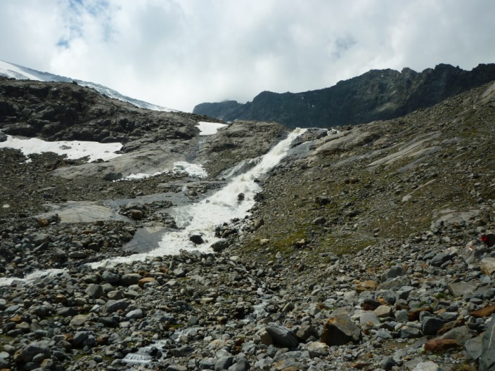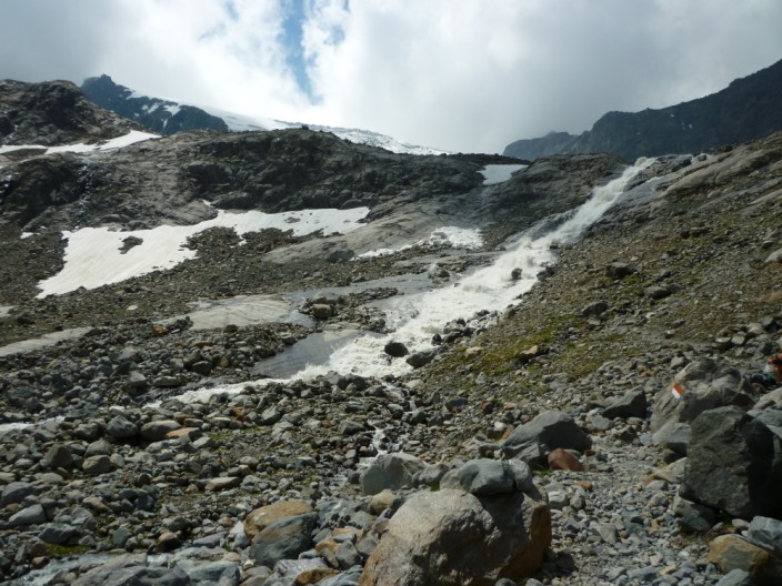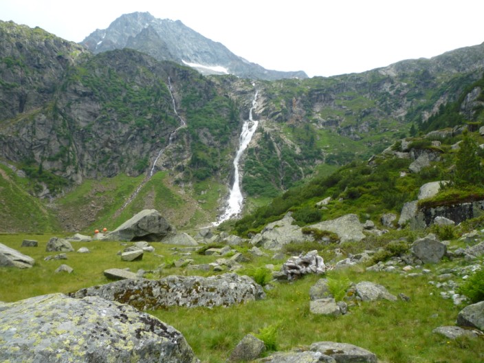 We caught the bus to the Mutterbergalm and took the gondola to the Dresdner Hütte station. With full waterproofs on we set off into the mist and began to climb the boulder field. As we gained height the mist began to clear and by the time we reached Peiljoch we had good views in all directions, including to the snout of the glacier. We descended on a good path, taking the ‘Wild Water’ route near the outflow from the glacier. A short detour took us to the Blue Lake before descending to the Sulzenauhütte. After a short break here we continued down to the Sulzenau Alm and on through the woodland to descend to the bus stop. |