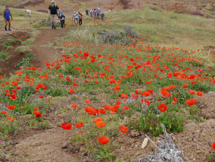 Poppies adorn the disturbed earth on each side of the path . . .