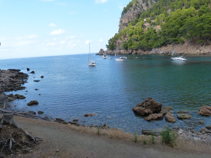 We caught the tram to Sóller then headed out to climb to the monastery with an unusual chapel nearby. From there we continued up to reach the mirador where we stopped for coffee and cake. Another short climb brought us to a contouring path where there were good views of the coast. After another section of the route we arrived at the farmhouse, Bálitx de Dalt, with its array of old farming implements displayed on the walls. A fresh orange juice was very welcome here before continuing on our way. After dropping down into a valley we climbed to a col where we stopped for lunch. Continuing on another contouring path we eventually arrived at Cala Tuent where some headed for the restaurant bar while others spent time on the beach. From here the coach took a long twisting road which ascended into the mountains and back to the hotel. |