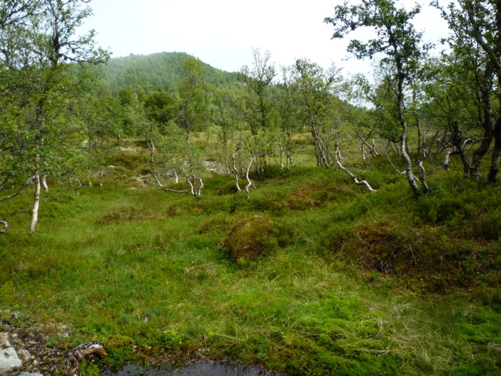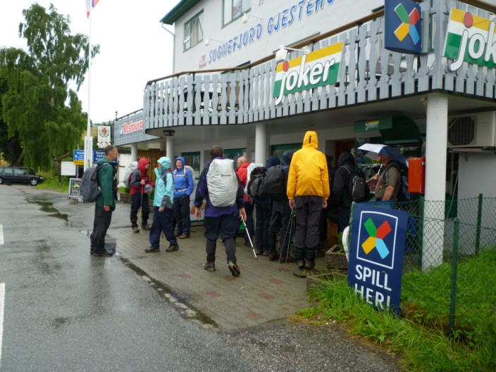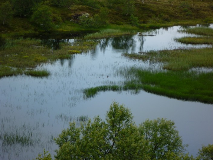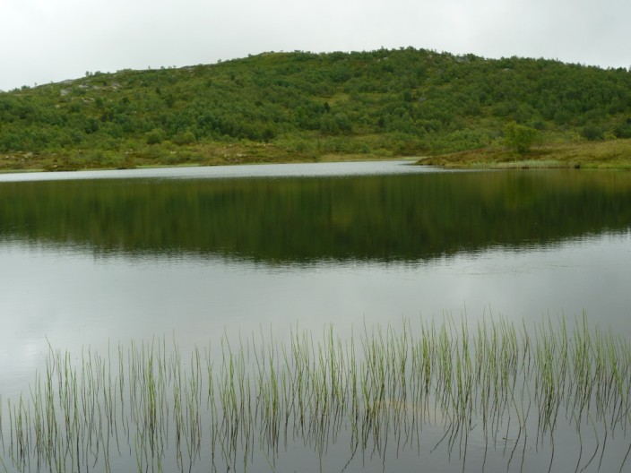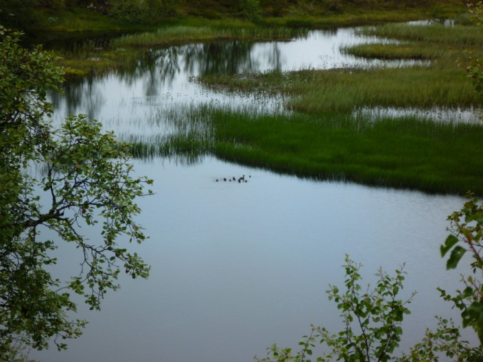 The forecast for Dragsvik was not a good one so it was decided to take the ferry to Vangsnes as the opposite side of the fjord generally had better weather. Soon after setting off we reached the 40 feet high statue of Fridtjof (hero of a 13th century Icelandic saga) presented by Kaiser Wilhelm II. Continuing on our route, a wide track zig-zagged up the hillside but it was much more interesting to follow the shortcuts through the trees. Arriving at the first lake by late morning, it was an ideal spot for a morning break. Continuing along the track, which was boggy in places, we eventually reached a high plateau with a number of buildings and a large lake – perhaps a summer meadow in the past. The group went in various directions to pick a spot for lunch and I chose a position overlooking the lake. Here I watched a family of small water birds – one adult and about eight youngsters. These were quite small but the young chicks seemed to be able to travel at incredible speed. An easy walk took us back long the same track to Vangsnes and the ferry to Dragsvik.
